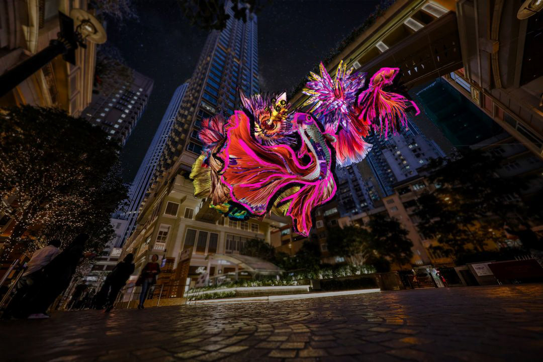 Hanging down from Lee Tung Avenue’s iconic bridge, our field of goldfish-inspired flowers crowns the view of Hong Kong’s architecture.